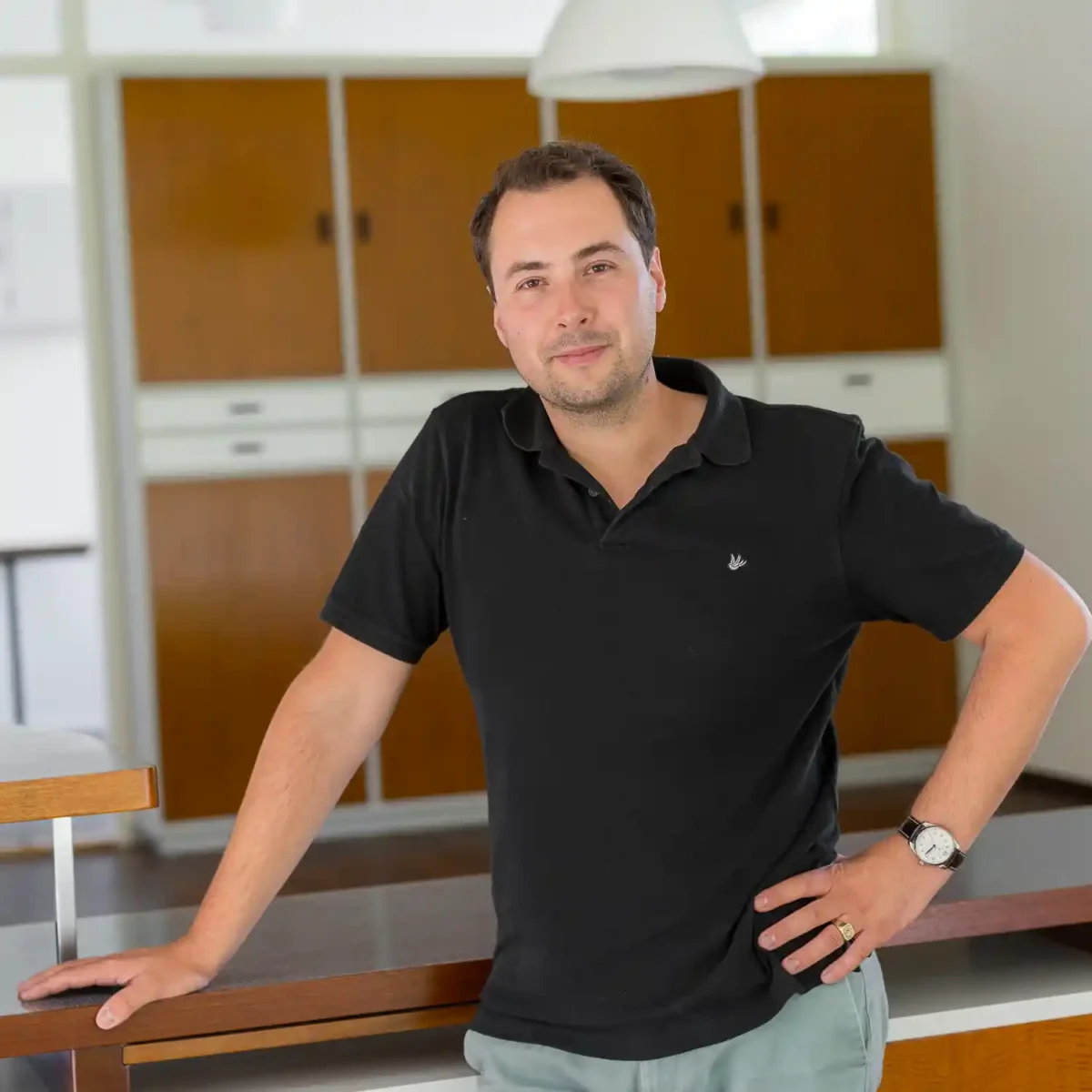 ‘In Nijmegen heb ik bij de verhuizing al onze meubels weggegeven of aan de straat gezet. Want toen we hier kwamen wonen was alles blijven staan: de tafels die mijn vader had ontworpen en de Carimate stoelen van ontwerper Vico Magistretti, de bankjes van Dom Hans van der Laan, mijn vaders leermeester, en de kasten van hem die mijn vader later in licentie liet maken door een timmerman.