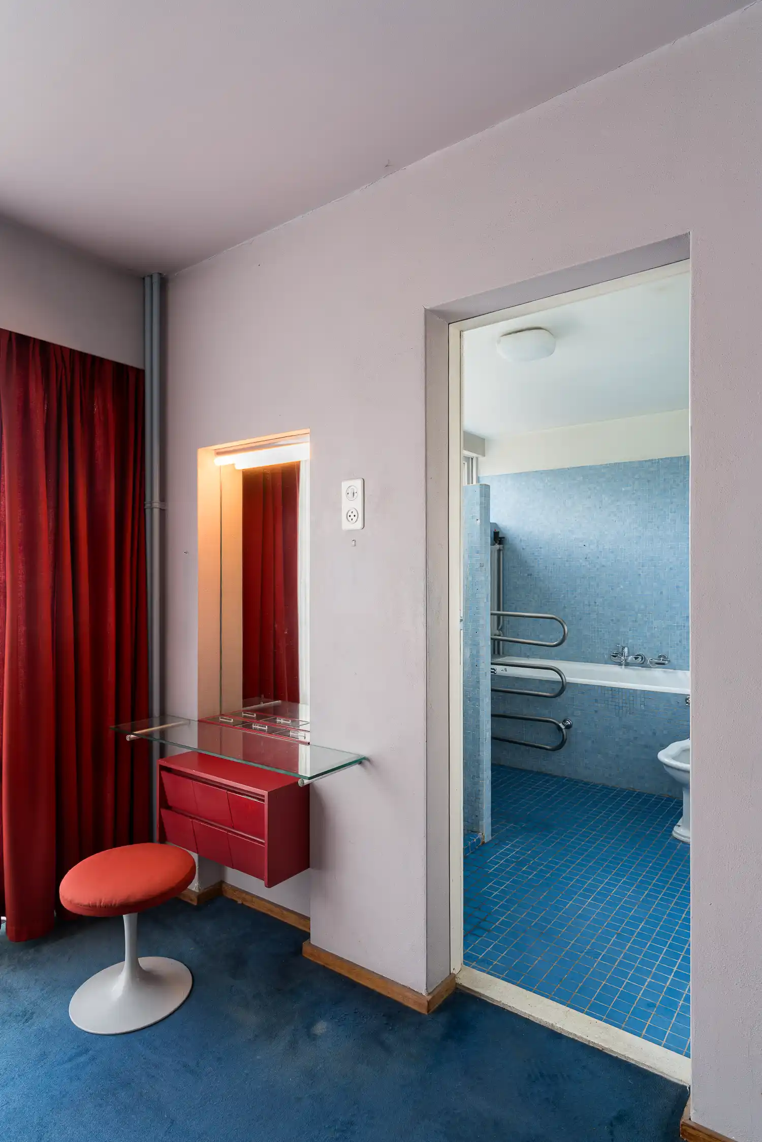 De vaste afwerking is heel nadrukkelijk aanwezig, zoals een uitbundige hoeveelheid vaste kastruimte met zelfs een kast voor de grammofoonplatencollectie van Henk van Gelderen, de omkasting van het ouderlijk bed en de kaptafel van Beryl met handige vakjes voor make-up en sieraden.