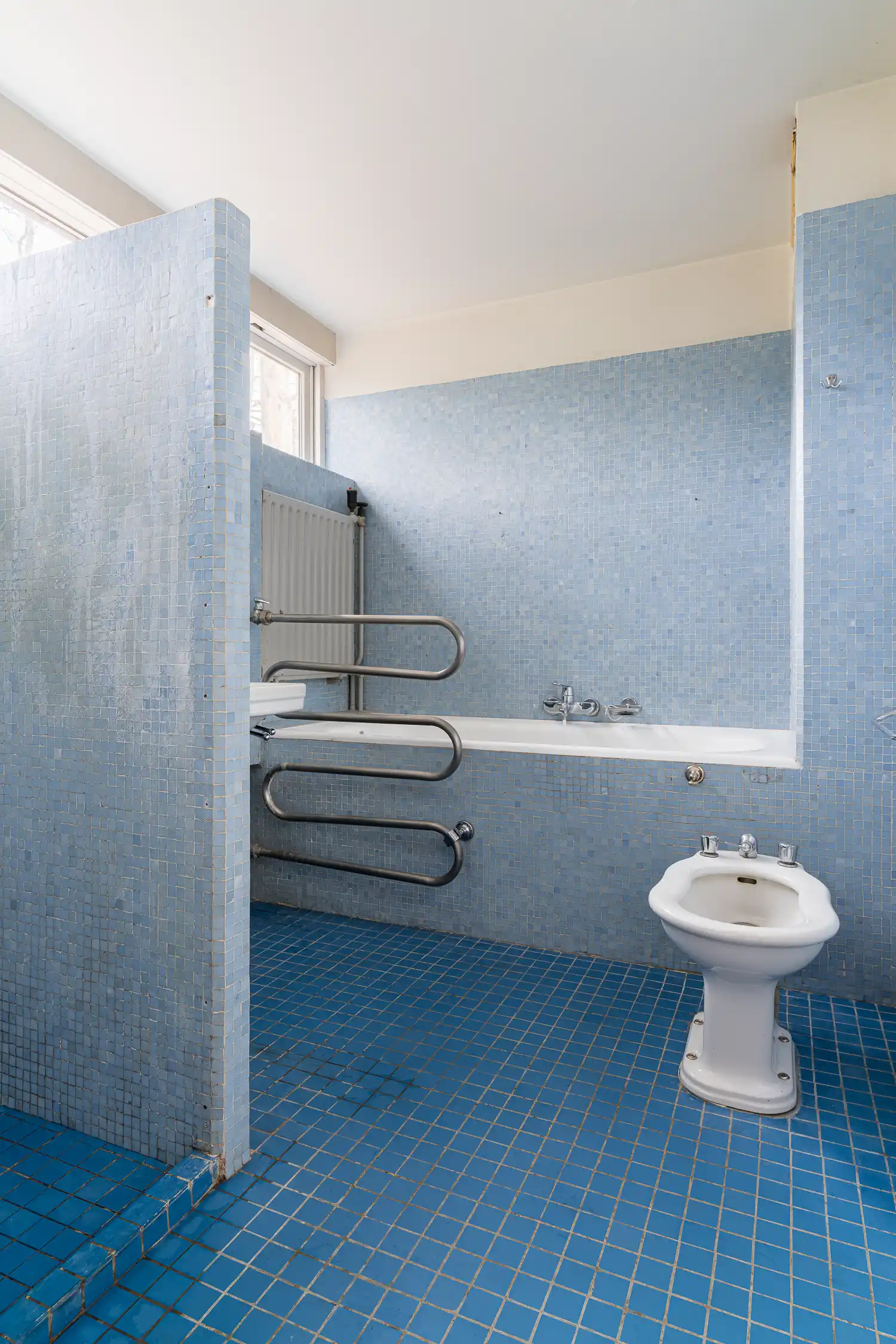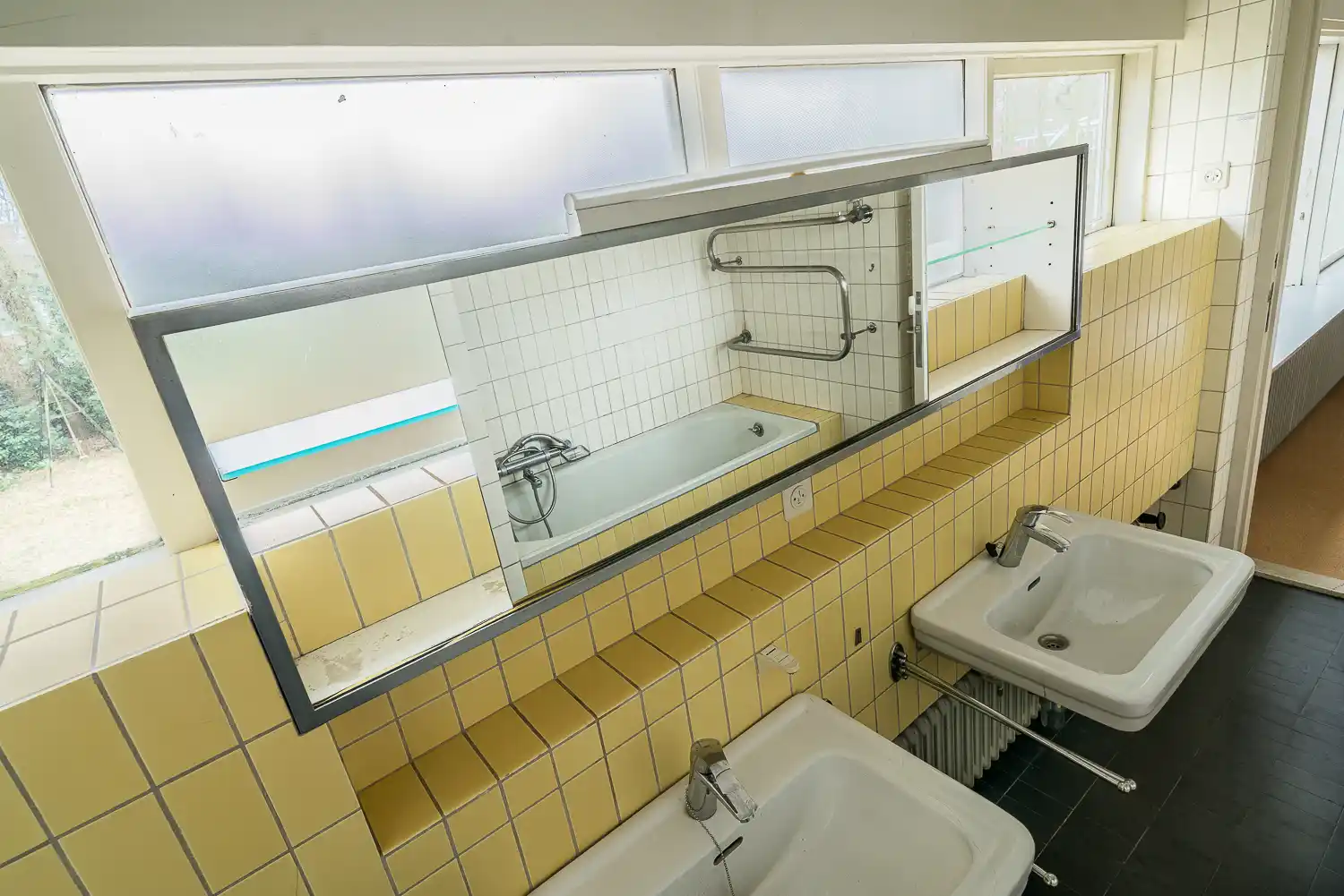 De badkamer boven is vanuit de gang via de wc en vanuit twee slaapkamers toegankelijk en beschikt over twee wastafels, een spiegelnis en een bad. Een detail herinnert aan de persoonlijke geschiedenis van de familie: boven het bad zijn vijf tegels opgenomen in de betegeling met de geboortedata en namen van de vijf kinderen: Matthieu, Saskia, Caroline, Wouter en Heleen, geboren tussen 1956 en 1963.