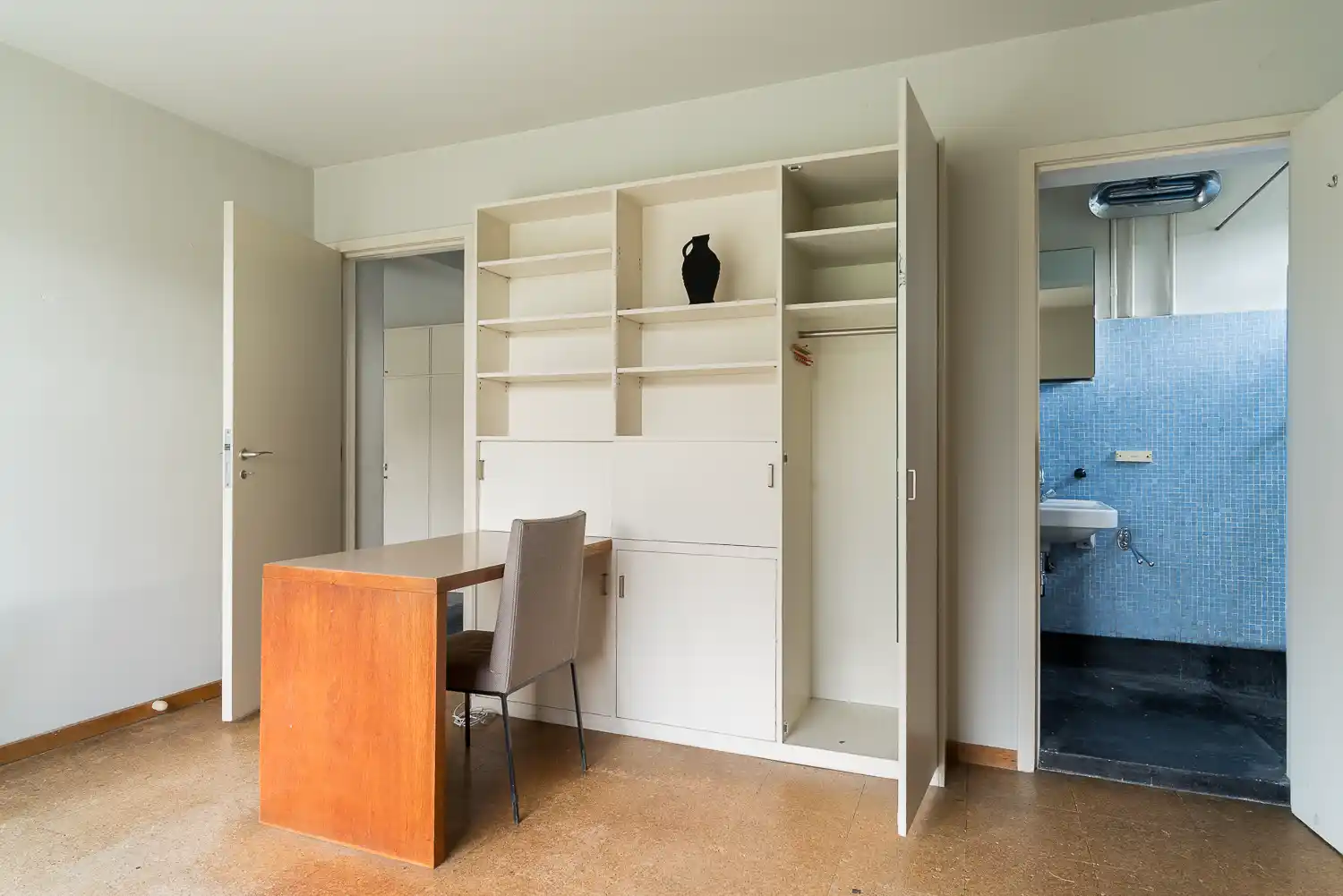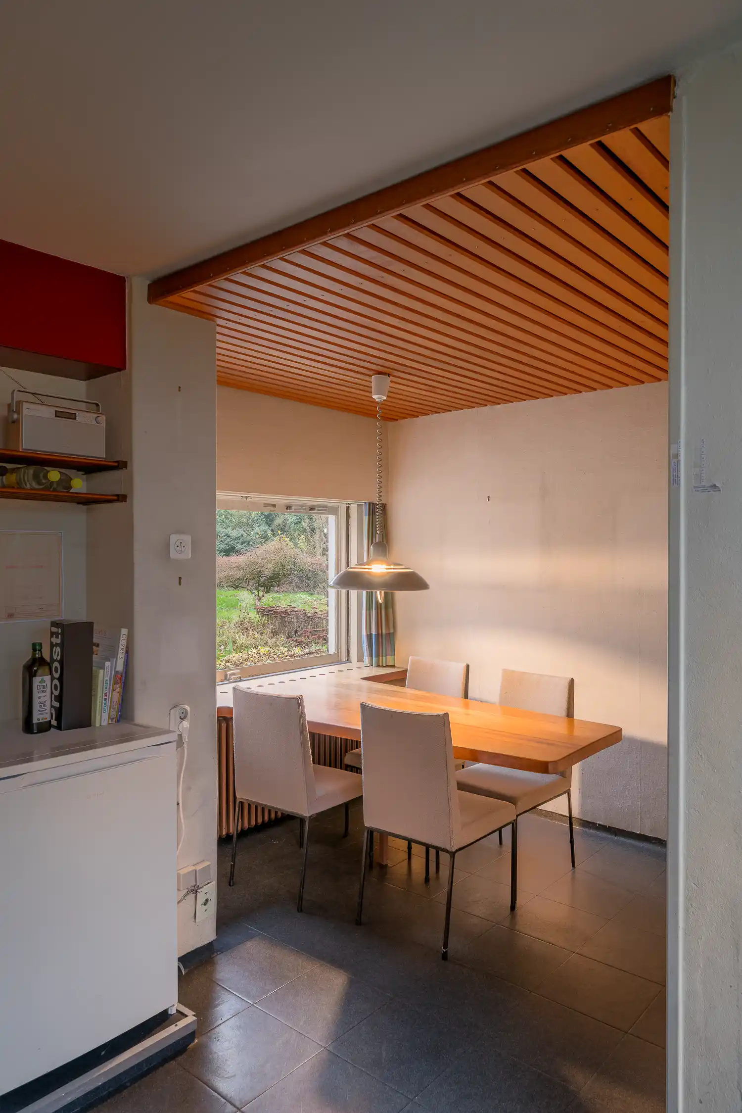 Deze kastenwand is ook aan de zijde van de keuken nog intact evenals enkele keukenkastjes en de later uitgebreide zithoek met eettafel voor de kinderen. De rest van de keuken is vernieuwd en de vloer heeft een nieuwe afwerking gekregen. Het raam kon oorspronkelijk naar beneden geschoven worden zodat er openheid was naar de tuin.