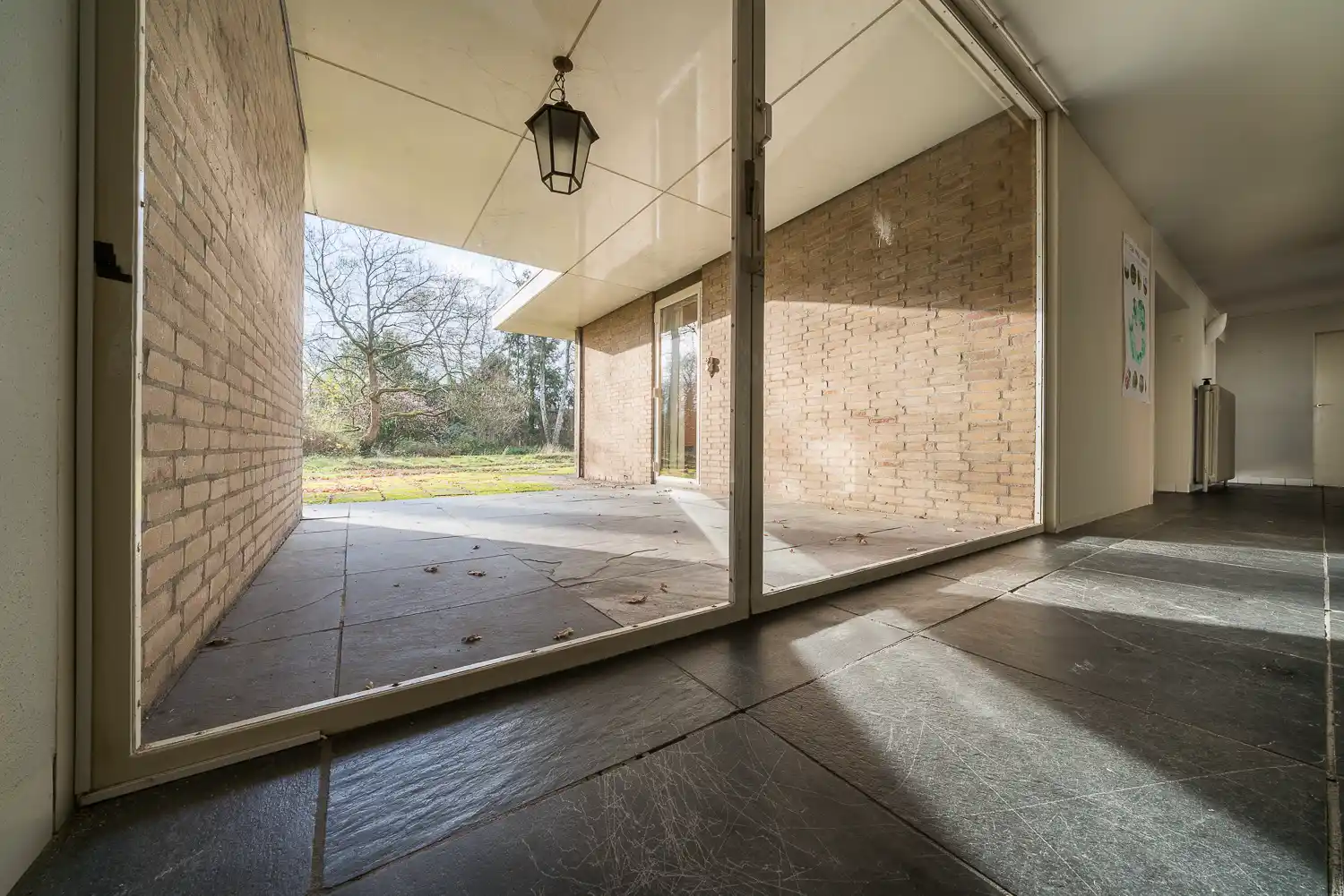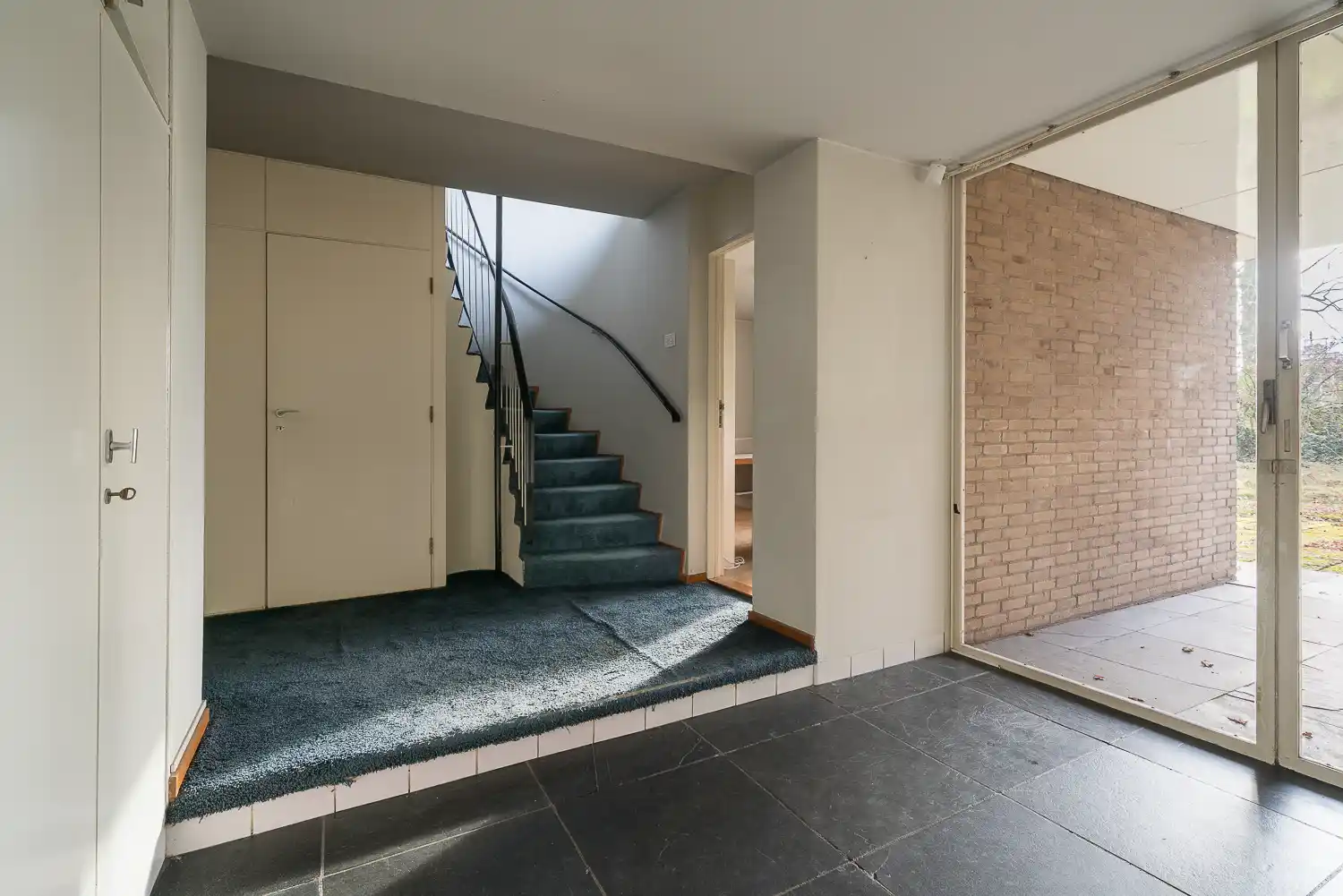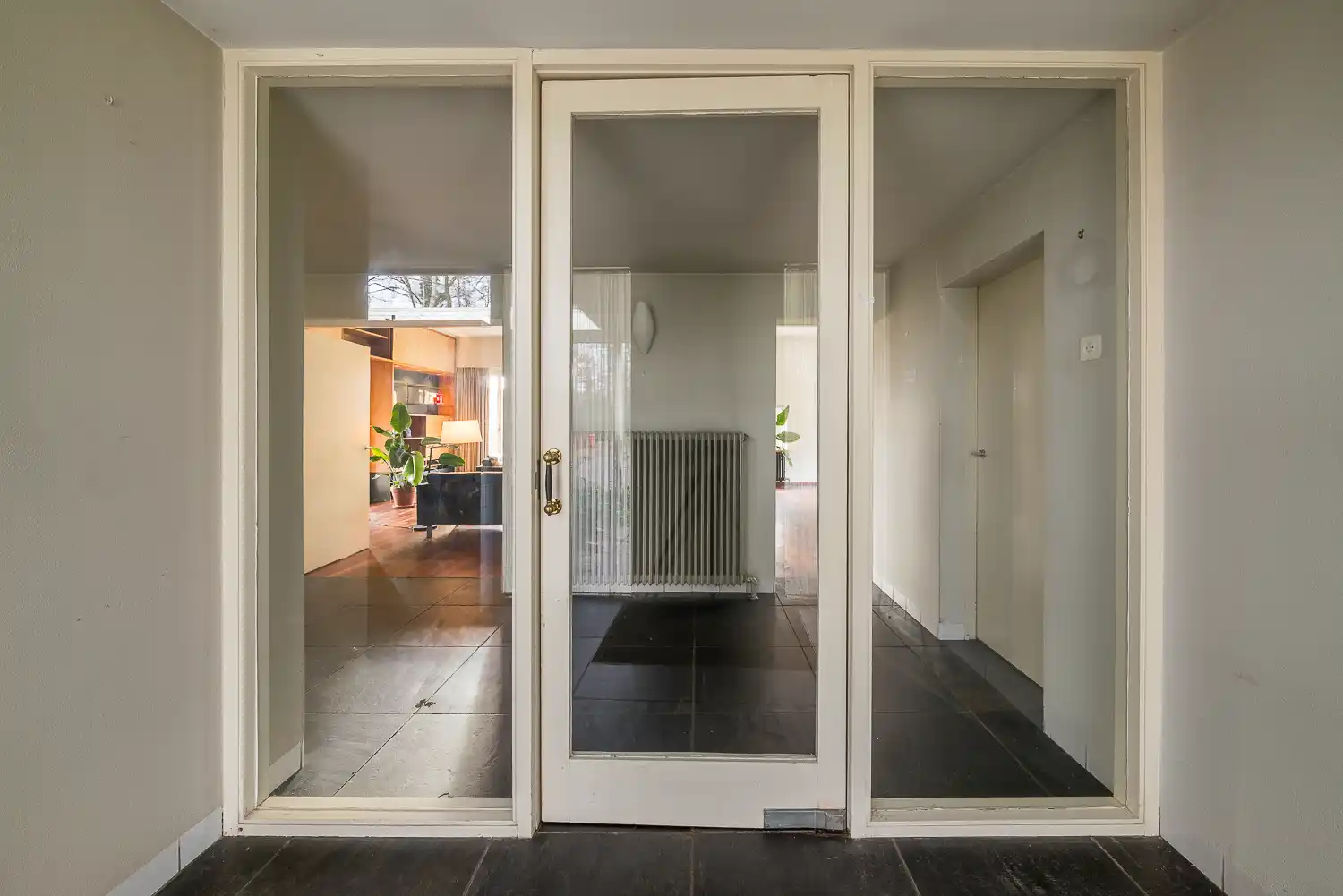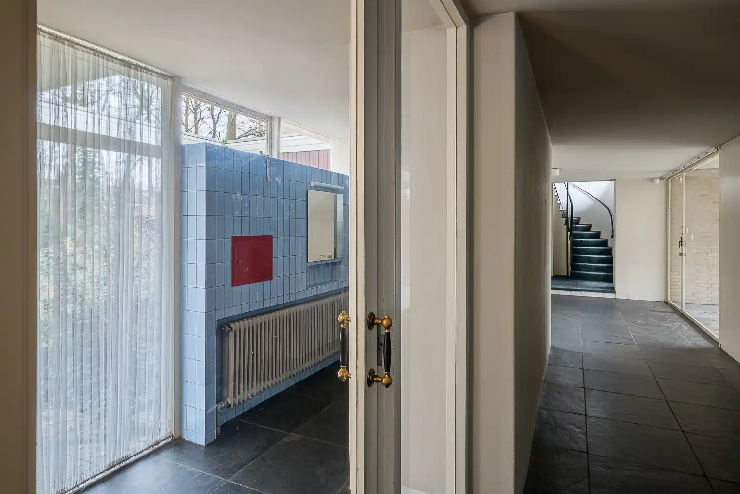 De vloeren in de vestibule met garderobe, de gang en het inpandige terras zijn belegd met grote tegels zwarte leisteen. In de garderobe zijn ruimten uitgespaard voor de jassen aan twee zijden. De muur aan de noordkant is betegeld met lichtblauwe tegels tot aan de vensterstrook onder het plafond. In die muur bevindt zich een rood geschilderd postluik, een spiegelnis en een ingebouwde radiator. De wand is doorgetrokken tot in de toiletruimte.