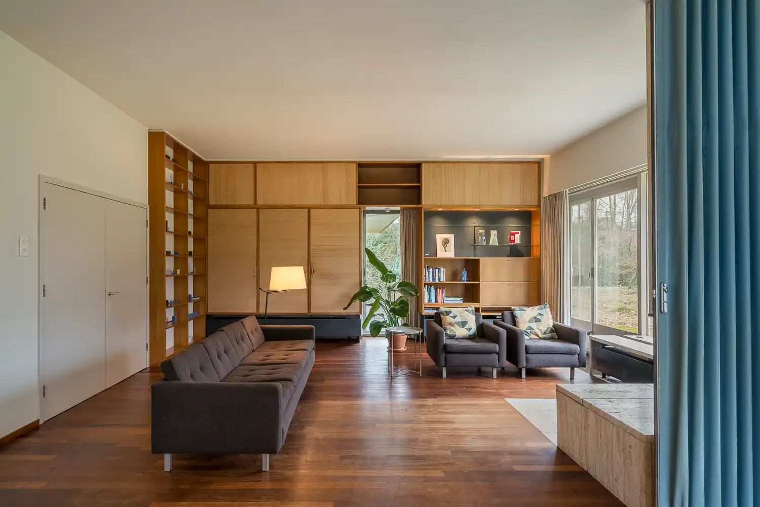 De hele wand aan de oostzijde van de woonruimte wordt in beslag genomen door een kastenwand, deels open en deels afgesloten met kastdeuren. Deze kasten zijn bekleed met zogenaamd grasbehang, deels in horizontale en deels in verticale richting geplaatst. Samen met de boekenkast aan de noordwand biedt dit houten wandmeubel een intieme achtergrond voor de zithoek.