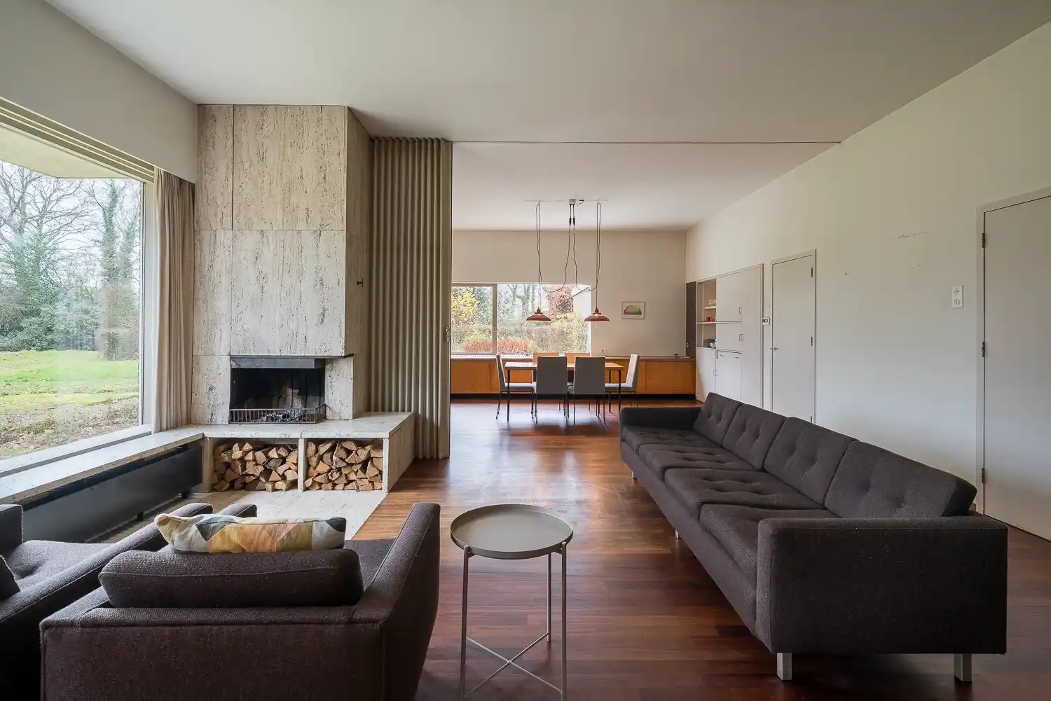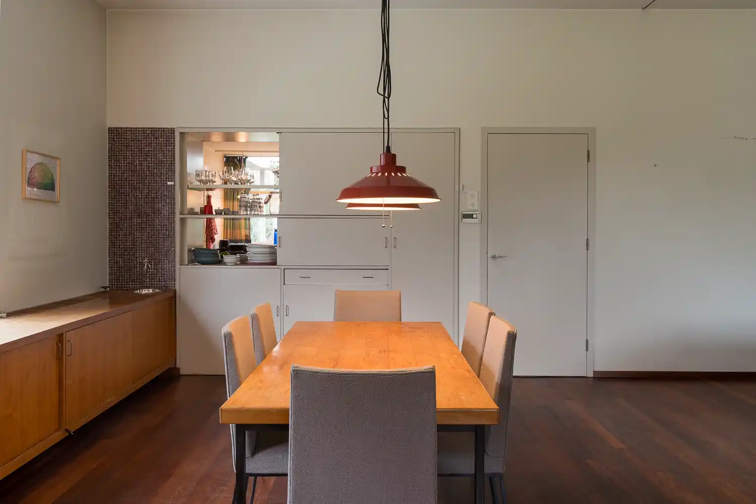 De kersenhouten eettafel naar ontwerp van Salomonson en de stoelen van Jac. Haan staan nog steeds in het midden van de ruimte. De L-vormige lage ‘buffetkast’, door de architect in detail ontworpen, is alleen nog aanwezig aan de lange zijde onder het brede venster (westwand). Daaronder is een radiator aangebracht. Ook het fonteintje waar Beryl haar gieter kon vullen bleef bewaard, inclusief het ‘spatscherm’ van bruine glasmozaïeksteentjes. Aan de korte zijde (zuidwand) is het deel van het blank houten buffet weggehaald waar Beryl haar bureau had (de laden bleven bewaard). Tegen die wand werd een zeventiende-eeuwse kast geplaatst: een erfstuk van haar ouders.