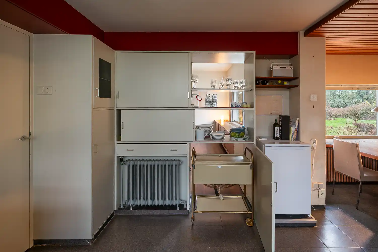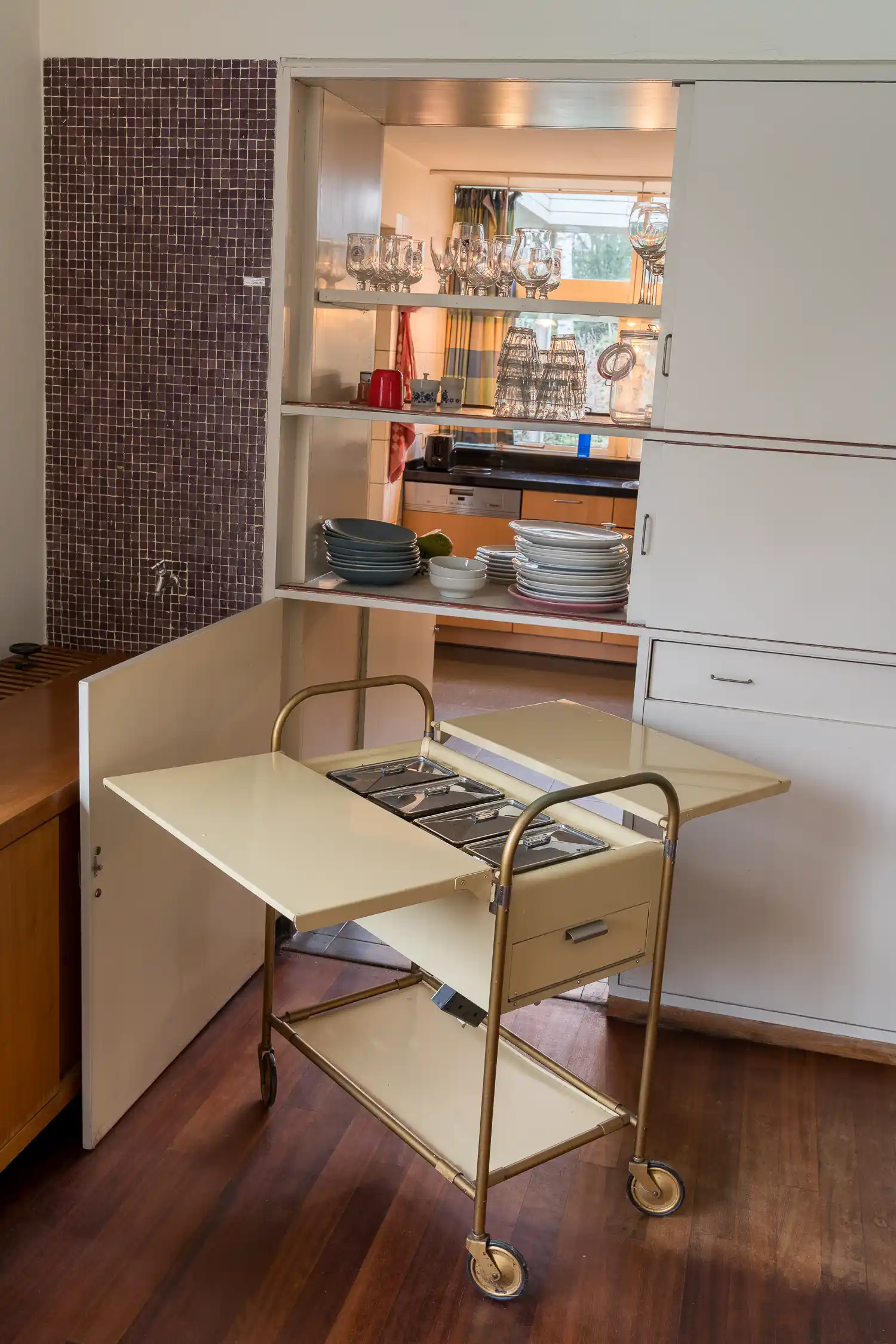 De kastenwand aan de noordzijde kan zowel vanuit de eetkamer als vanuit de keuken worden geopend. Deze doorgeefkast omvat naast bergruimte voor serviezen ook een berging voor een zogenaamde (au) ‘bain-marie trolley’ of warmhoudwagen. De wagen heeft een gebronsd frame en gepoedercoate, lichtgele bak met een besteklade en uitklapbare zijbladen. In de bak hangen de roestvrijstalen dekselschalen. Het waterbad kan nog steeds worden aangesloten op de elektriciteit om de gerechten te kunnen warmhouden zonder dat ze aanbranden.