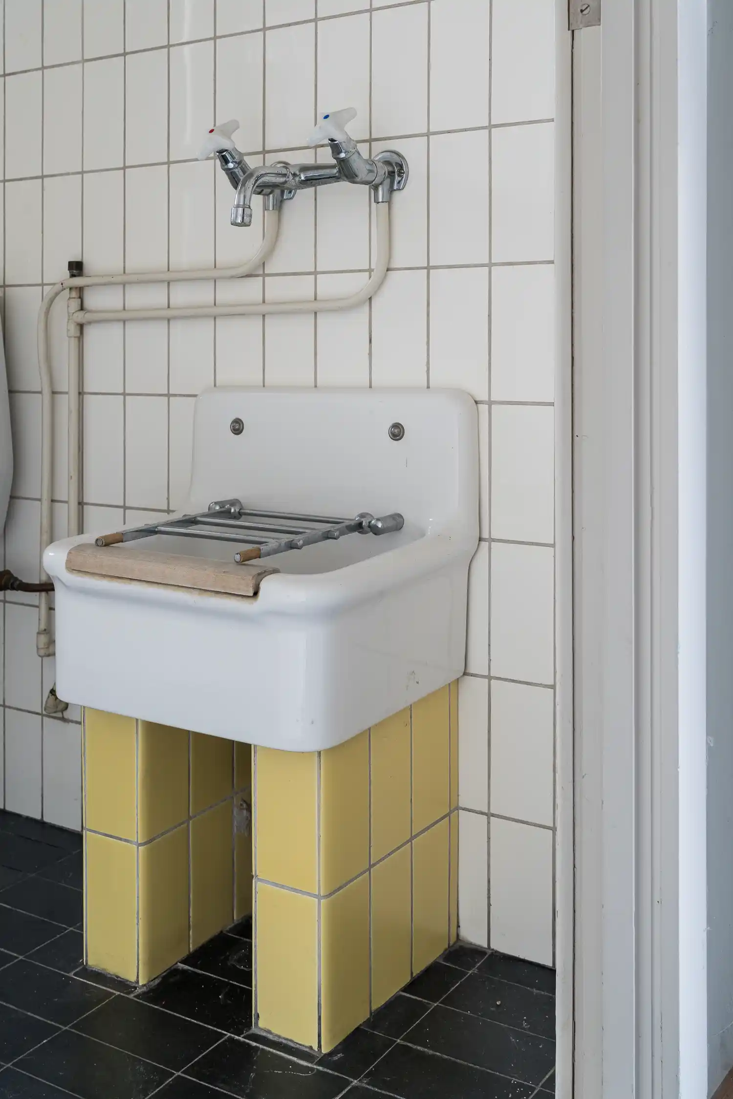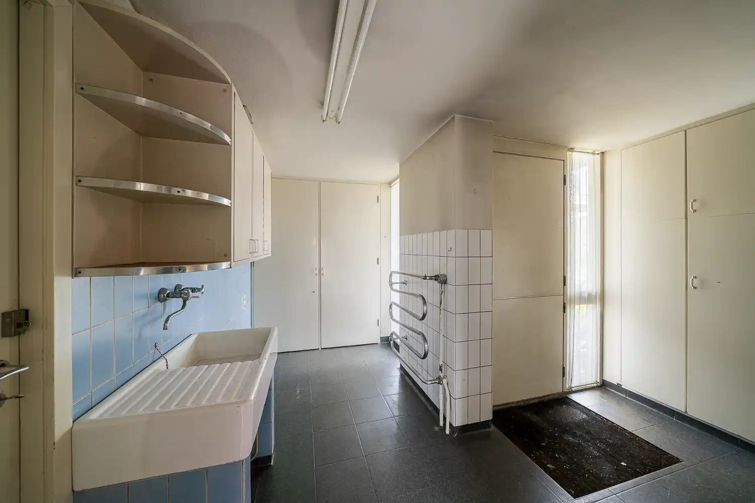 In de bijkeuken overheersen de vele vaste kasten en de witte en lichtblauw geglazuurde tegels. Het aanrecht is ook nog aanwezig. Mogelijk werden hier ook kleine wasjes gedaan; er was aanvankelijk waarschijnlijk geen wasmachine. De gebogen radiatorpijpen bieden ruimte voor het drogen van theedoeken en dergelijke.