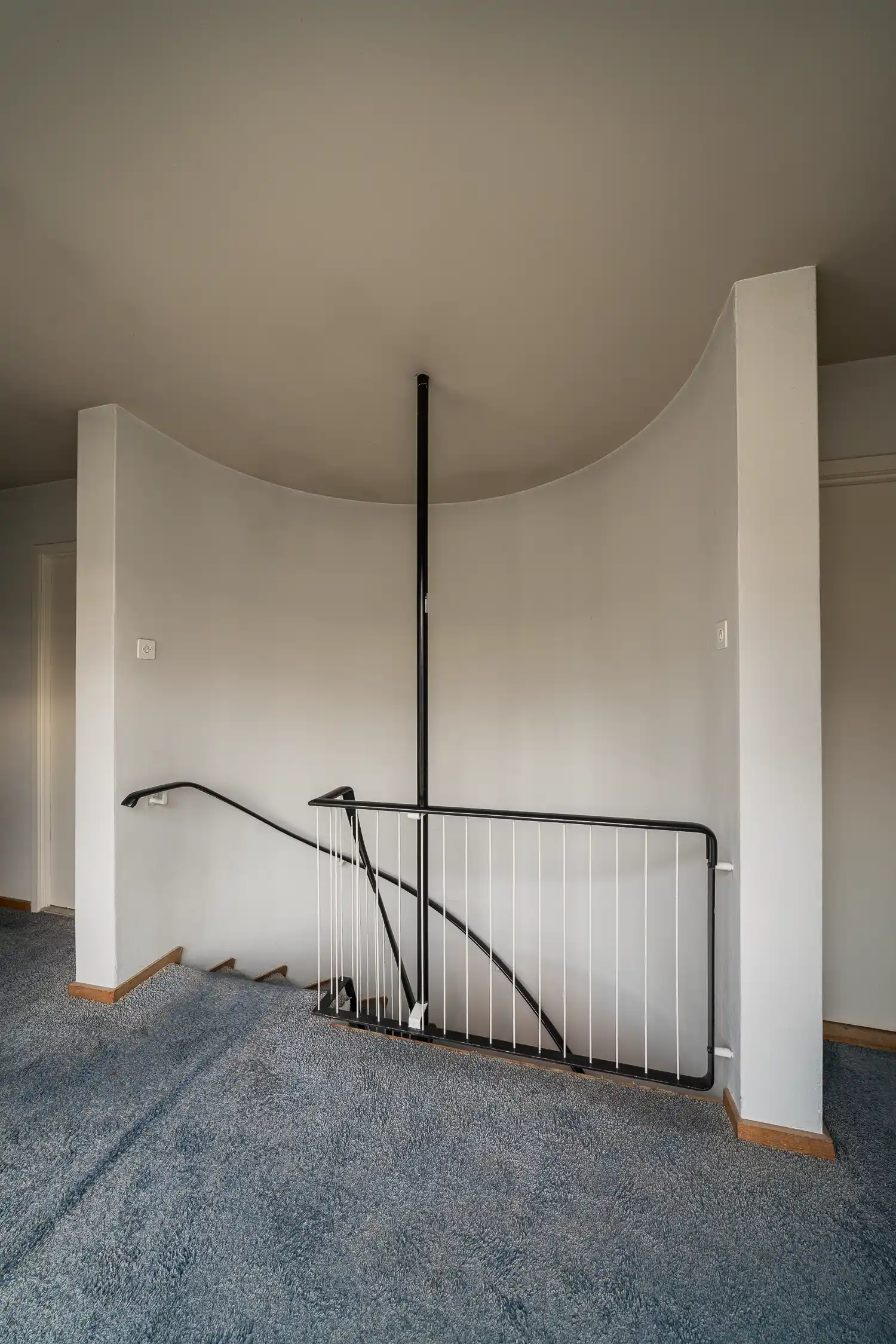 De trap is een wenteltrap die halfrond naar boven voert met een los staande stalen spil en sierlijke trapleuningen. Beneden bevinden zich links (noordoostkant) de ouderslaapkamer met ingebouwde kaptafel en eigen badkamer en rechts (zuidoostkant) de ruimte waar oorspronkelijk de studeerkamer van Henk zich bevond. Toen het de slaapkamer werd van de oudste zoon Matthieu kreeg hij er een eigen doucheruimte bij. De kamers zijn uitgerust met de nodige inbouwkasten en vaste interieuronderdelen.