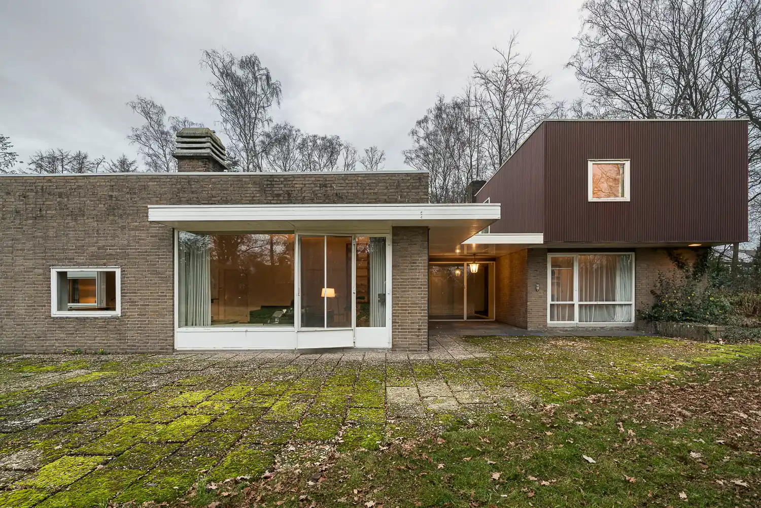 De gevels zijn opgebouwd uit blonde bakstenen en zijn op sommige plaatsen geaccentueerd door witgeverfde, houten daklijsten. Het hoge blokvolume is op de verdieping aan drie zijden betimmerd met verticaal geplaatste, cedarhouten planken, oorspronkelijk blank gelakt, maar in de loop der jaren steeds donkerder gebeitst. De Thermopane dubbele beglazing is grotendeels uit de bouwtijd.