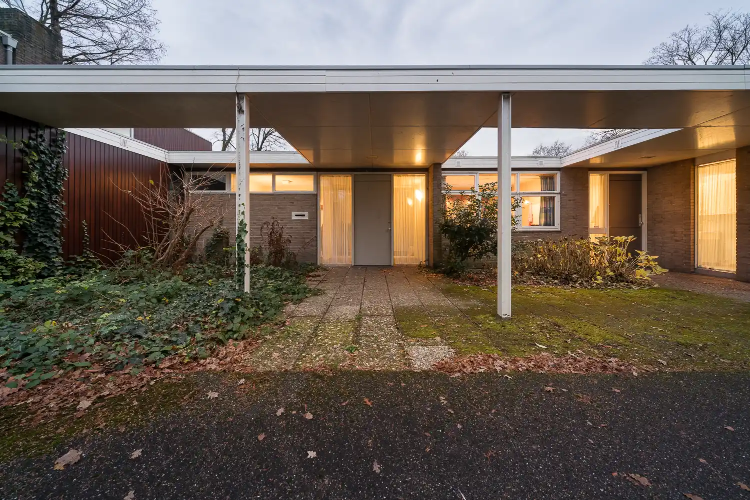Een van de meest opvallende karakteristieken van Huis Van Gelderen zijn de zorgvuldig ontworpen ‘zachte’ overgangszones tussen exterieur en interieur. Aan de voorzijde door het platte dak van de luifel met vierkante openingen om het daglicht in de woning te laten vallen. Aan de achterzijde door het deels inpandige terras dat besloten is, want omgeven door twee buitenmuren en een glazen pui, en tegelijk open is naar de tuin. Deze halve ‘patio’ is toegankelijk via een in staal gevatte, glazen schuifdeur in de gang die in de muur kan worden weggeschoven. Het inpandige terras en het entreegebied onder de luifel zorgen voor zachte overgangen, van buiten naar binnen en andersom.